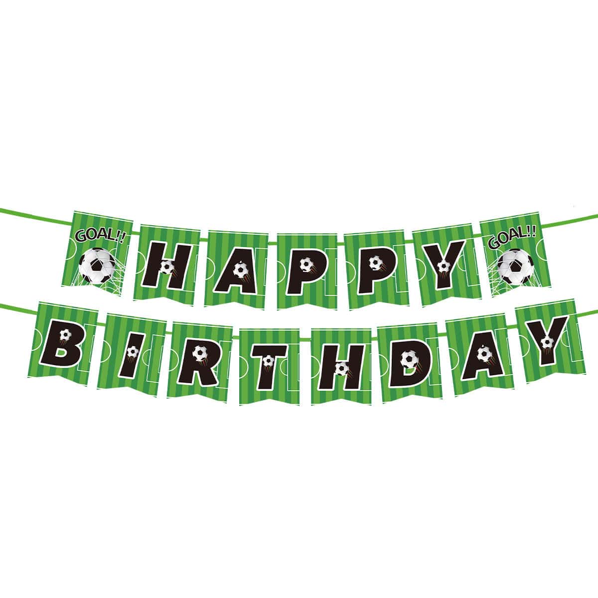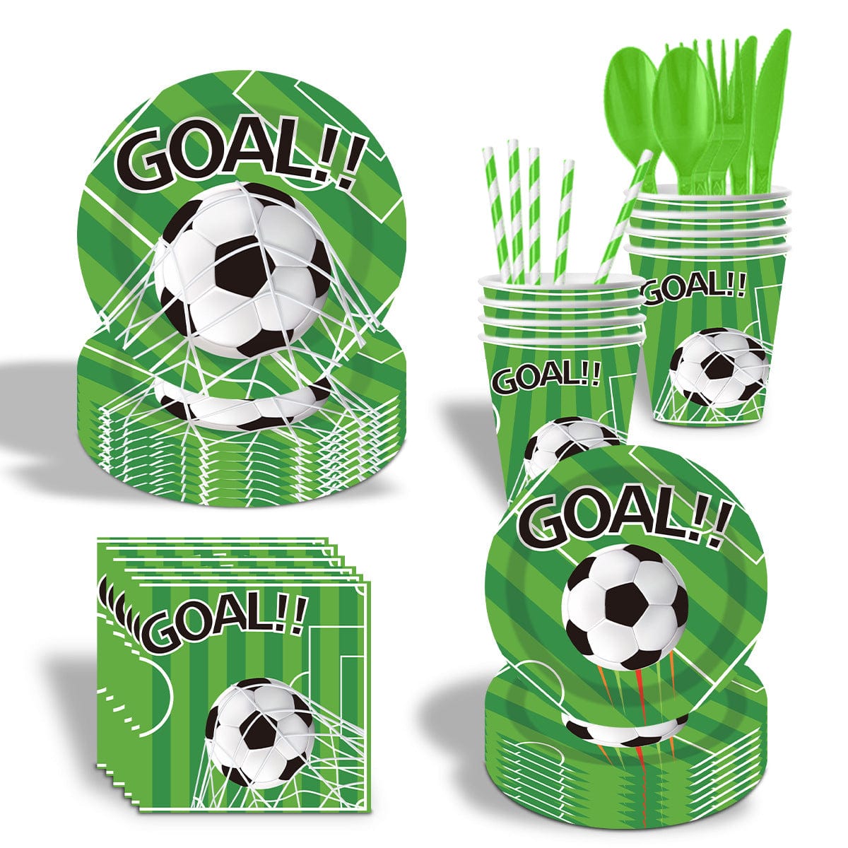 Featuring soccer ball prints, a “GOAL!!” design, and matching green field graphics, this set includes plates, cups, cutlery, napkins, and a “Happy Birthday” banner - everything you need for a fun, sporty celebration.